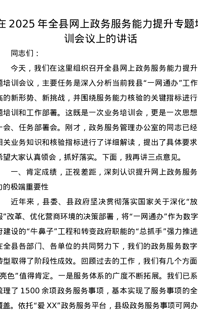 在2025年全县网上政务服务能力提升专题培训会议上的讲话
