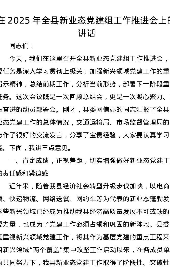 在2025年全县新业态党建组工作推进会上的讲话