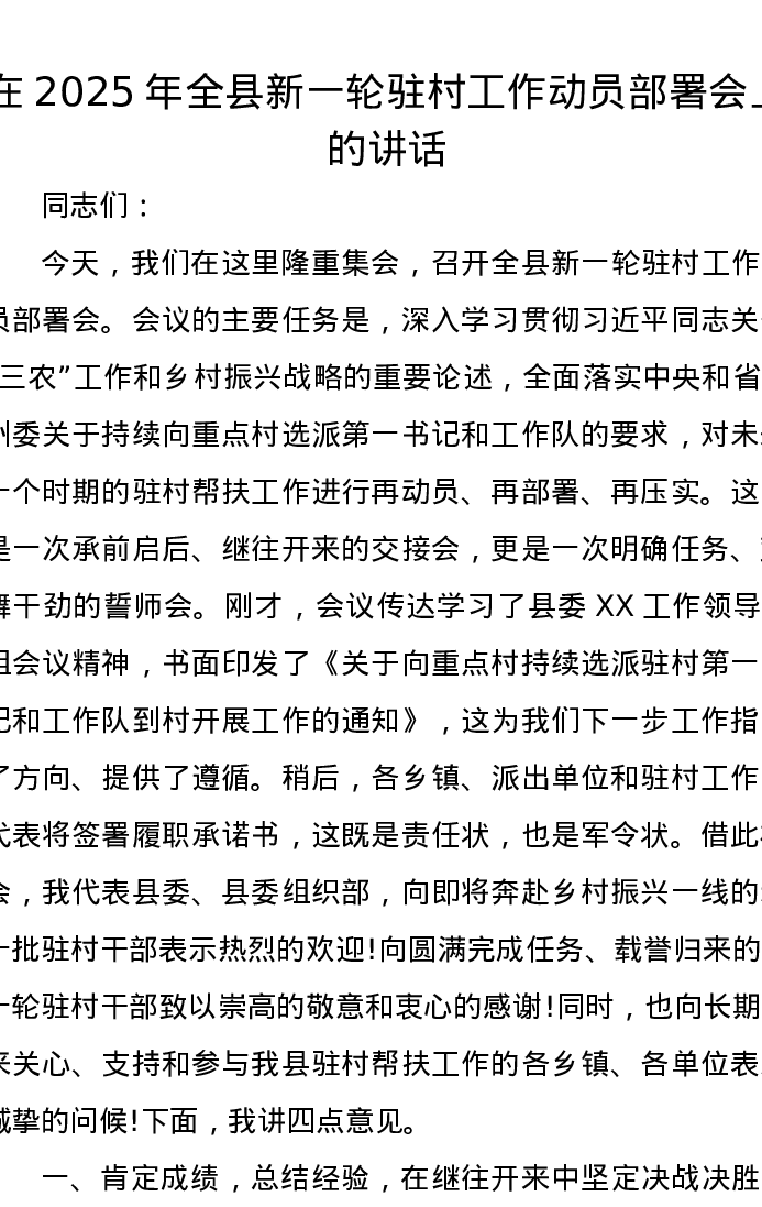 在2025年全县新一轮驻村工作动员部署会上的讲话