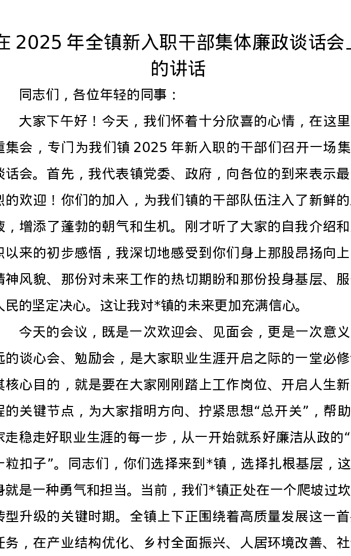在2025年全镇新入职干部集体廉政谈话会上的讲话