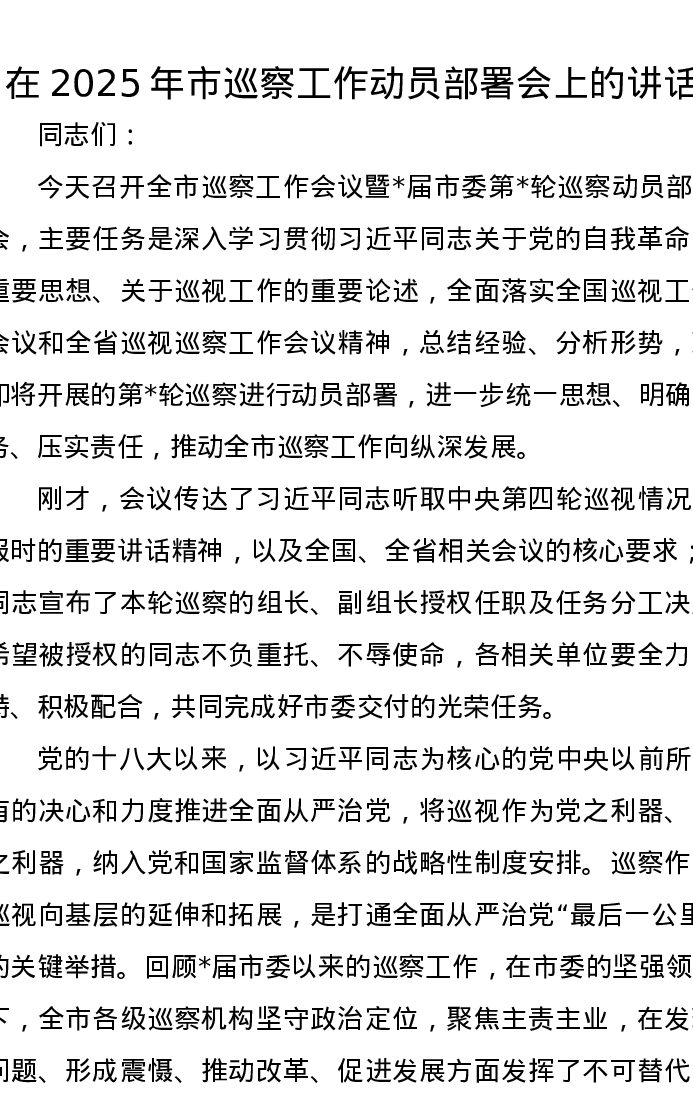 在2025年市巡察工作动员部署会上的讲话