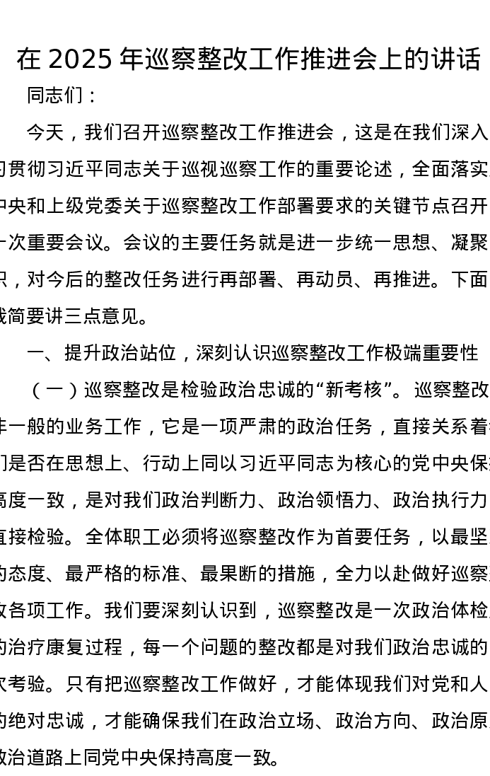在2025年巡察整改工作推进会上的讲话