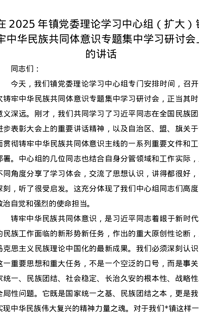 在2025年镇党委理论学习中心组(扩大)铸牢中华民族共同体意识专题集中学习研讨会上的讲话