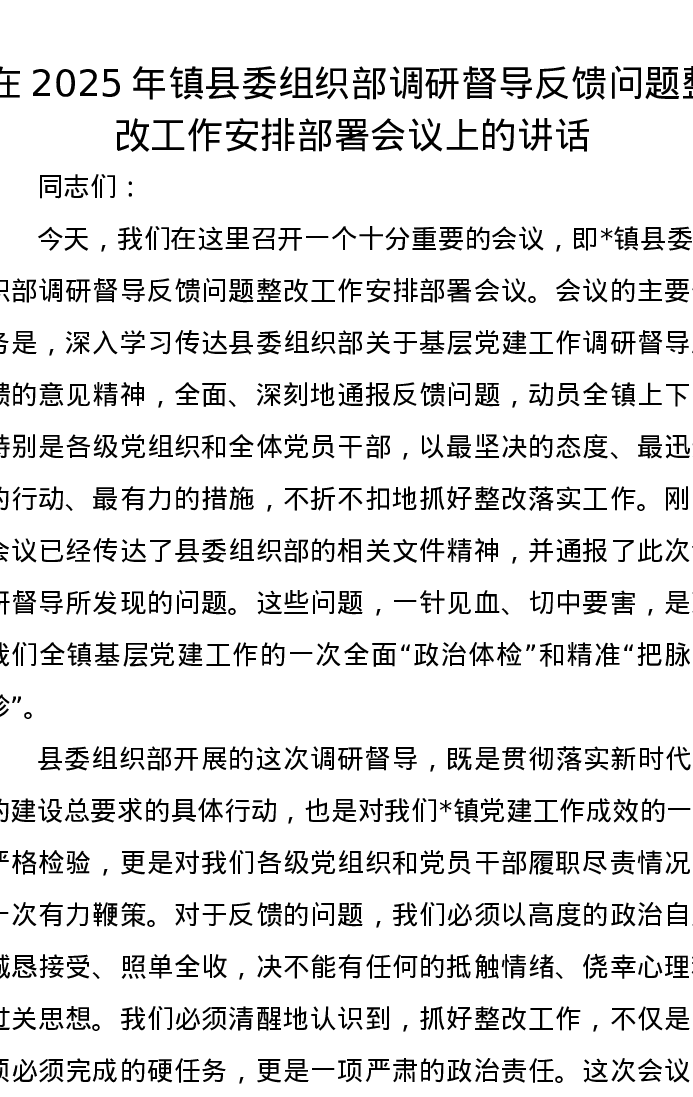 在2025年镇县委组织部调研督导反馈问题整改工作安排部署会议上的讲话