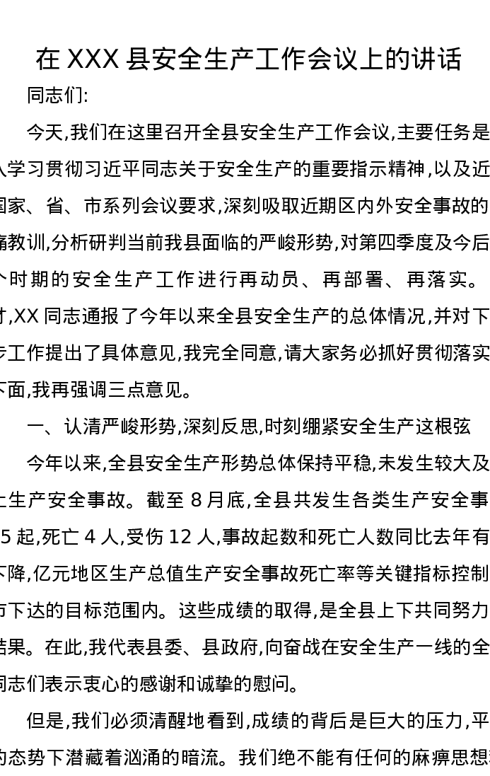 在XXX县安全生产工作会议上的讲话