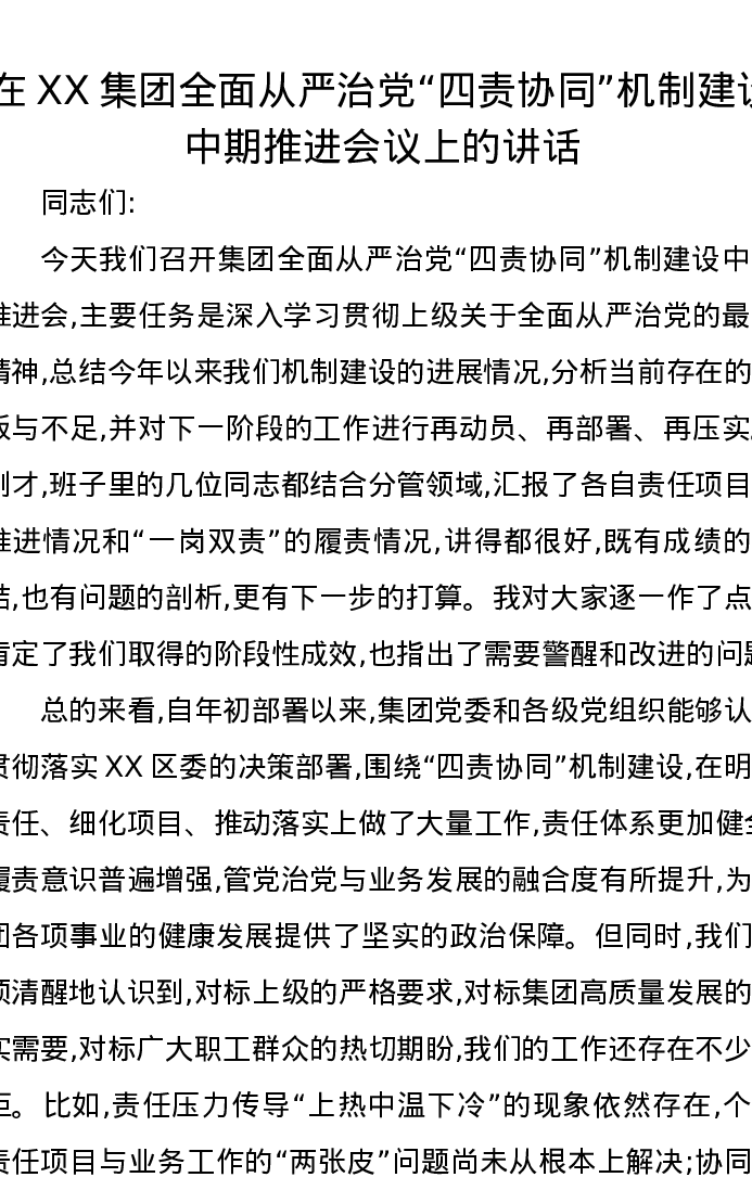 在XX集团全面从严治党“四责协同”机制建设中期推进会议上的讲话