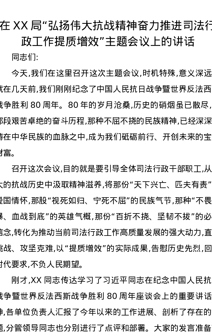 在XX局“弘扬伟大抗战精神奋力推进司法行政工作提质增效”主题会议上的讲话