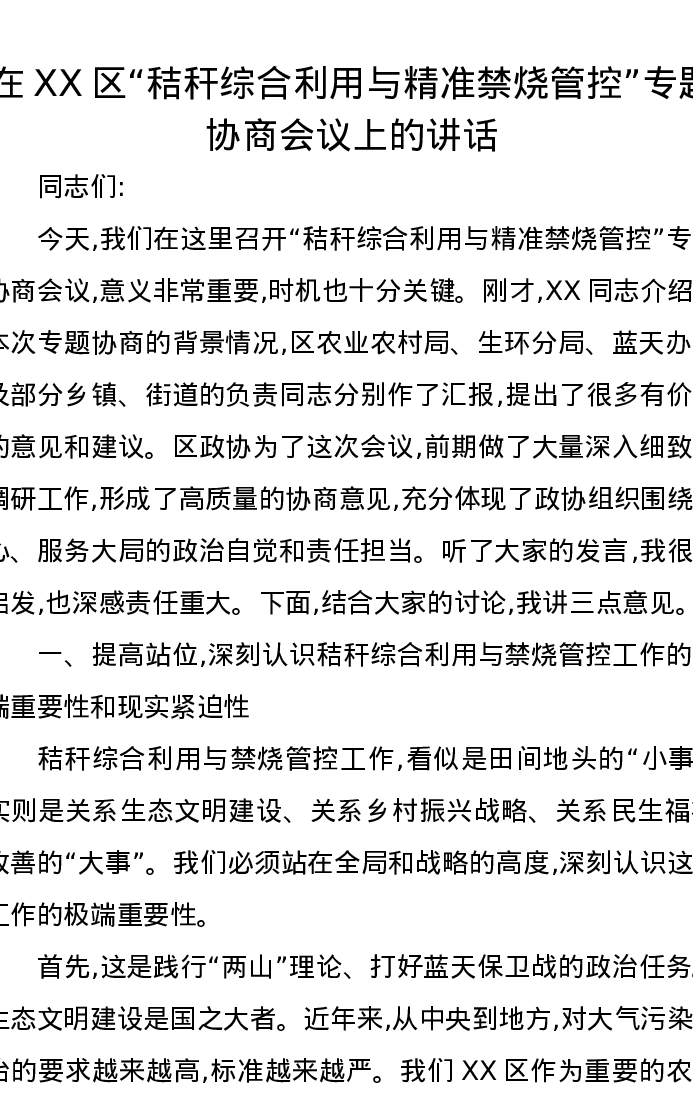 在XX区“秸秆综合利用与精准禁烧管控”专题协商会议上的讲话