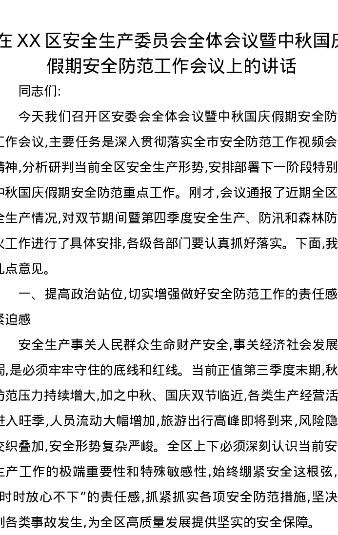在XX区安全生产委员会全体会议暨中秋国庆假期安全防范工作会议上的讲话