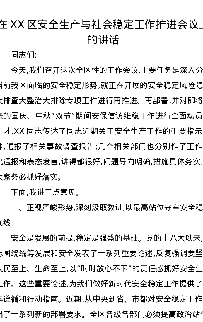 在XX区安全生产与社会稳定工作推进会议上的讲话