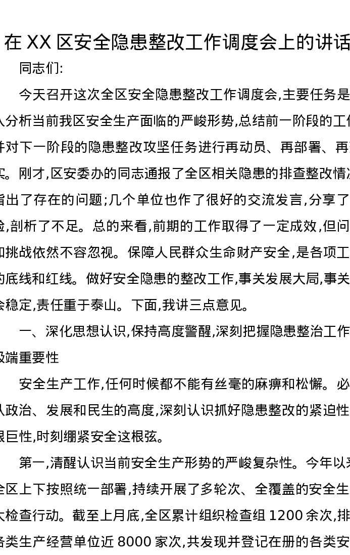 在XX区安全隐患整改工作调度会上的讲话