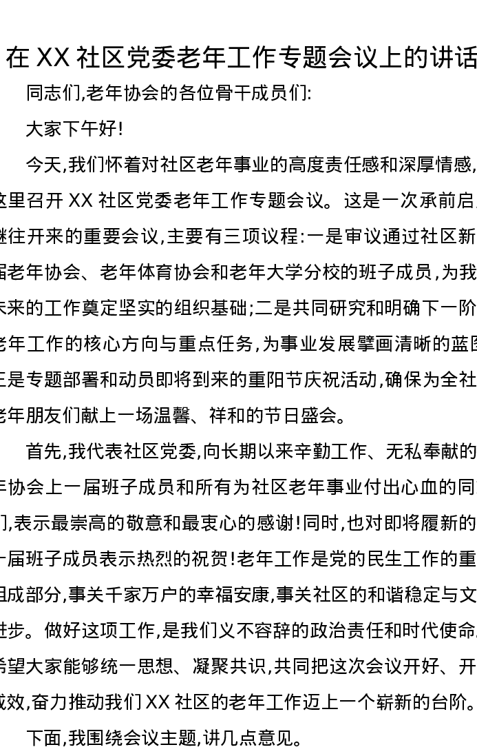 在XX社区党委老年工作专题会议上的讲话