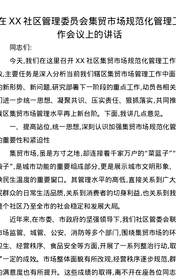 在XX社区管理委员会集贸市场规范化管理工作会议上的讲话
