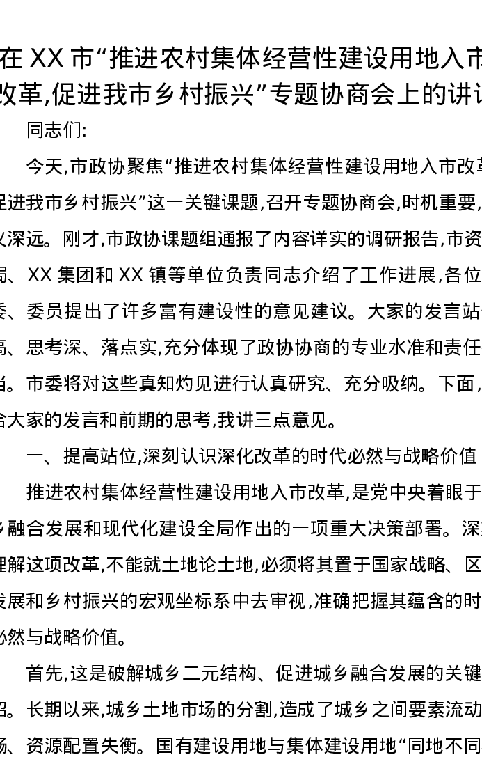 在XX市“推进农村集体经营性建设用地入市改革,促进我市乡村振兴”专题协商会上的讲话