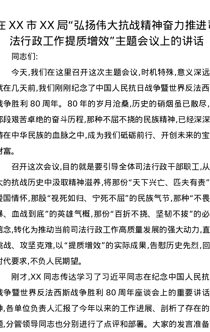 在XX市XX局“弘扬伟大抗战精神奋力推进司法行政工作提质增效”主题会议上的讲话