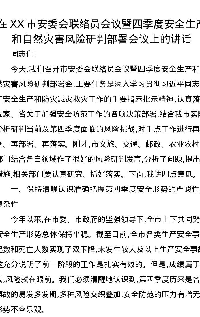 在XX市安委会联络员会议暨四季度安全生产和自然灾害风险研判部署会议上的讲话