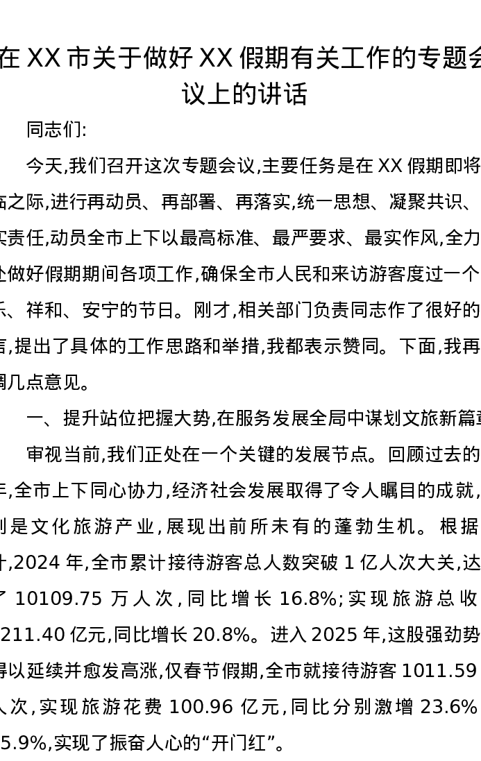 在XX市关于做好XX假期有关工作的专题会议上的讲话