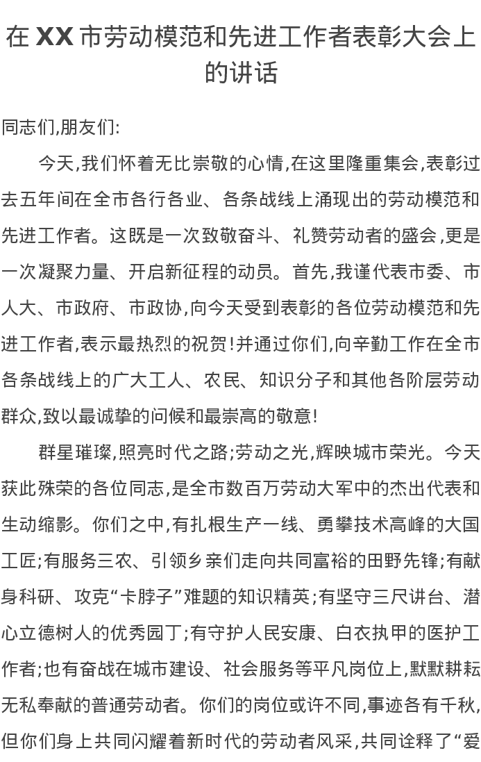 在XX市劳动模范和先进工作者表彰大会上的讲话