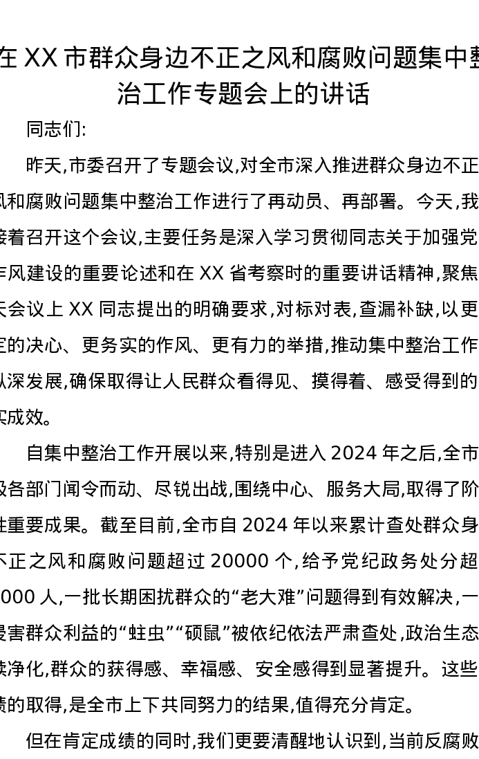 在XX市群众身边不正之风和腐败问题集中整治工作专题会上的讲话