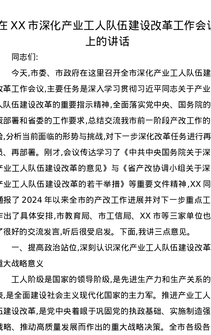 在XX市深化产业工人队伍建设改革工作会议上的讲话