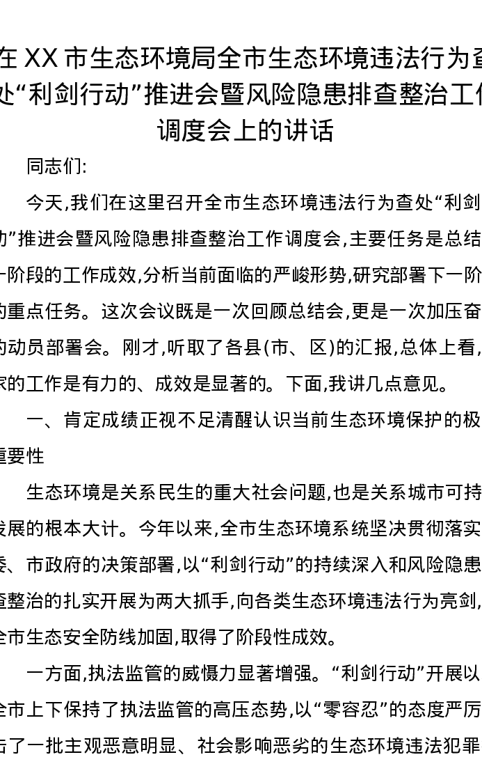 在XX市生态环境局全市生态环境违法行为查处“利剑行动”推进会暨风险隐患排查整治工作调度会上的讲话