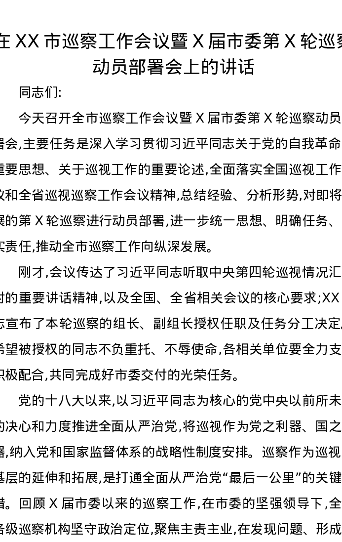 在XX市巡察工作会议暨X届市委第X轮巡察动员部署会上的讲话