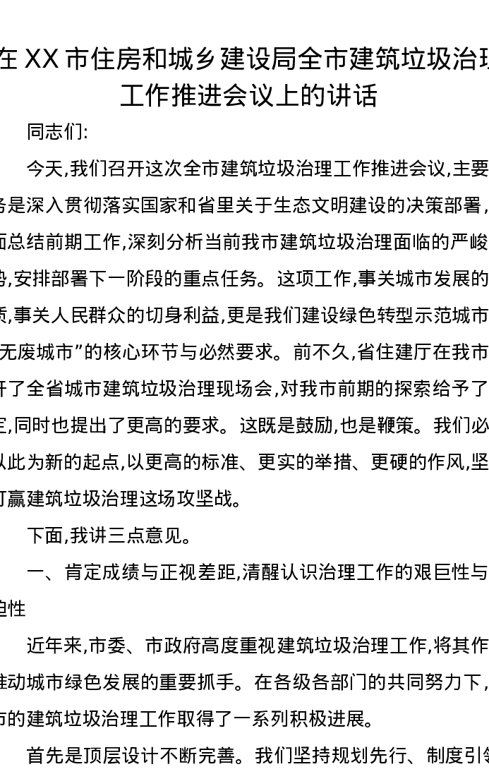在XX市住房和城乡建设局全市建筑垃圾治理工作推进会议上的讲话