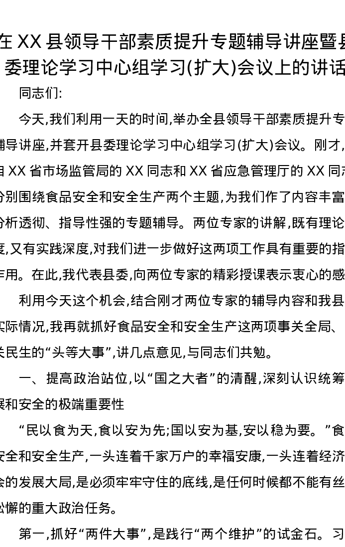 在XX县领导干部素质提升专题辅导讲座暨县委理论学习中心组学习(扩大)会议上的讲话