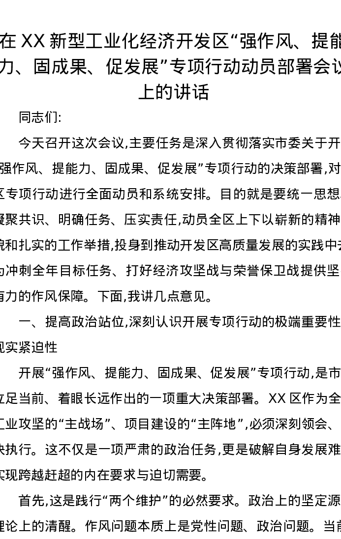在XX新型工业化经济开发区“强作风、提能力、固成果、促发展”专项行动动员部署会议上的讲话