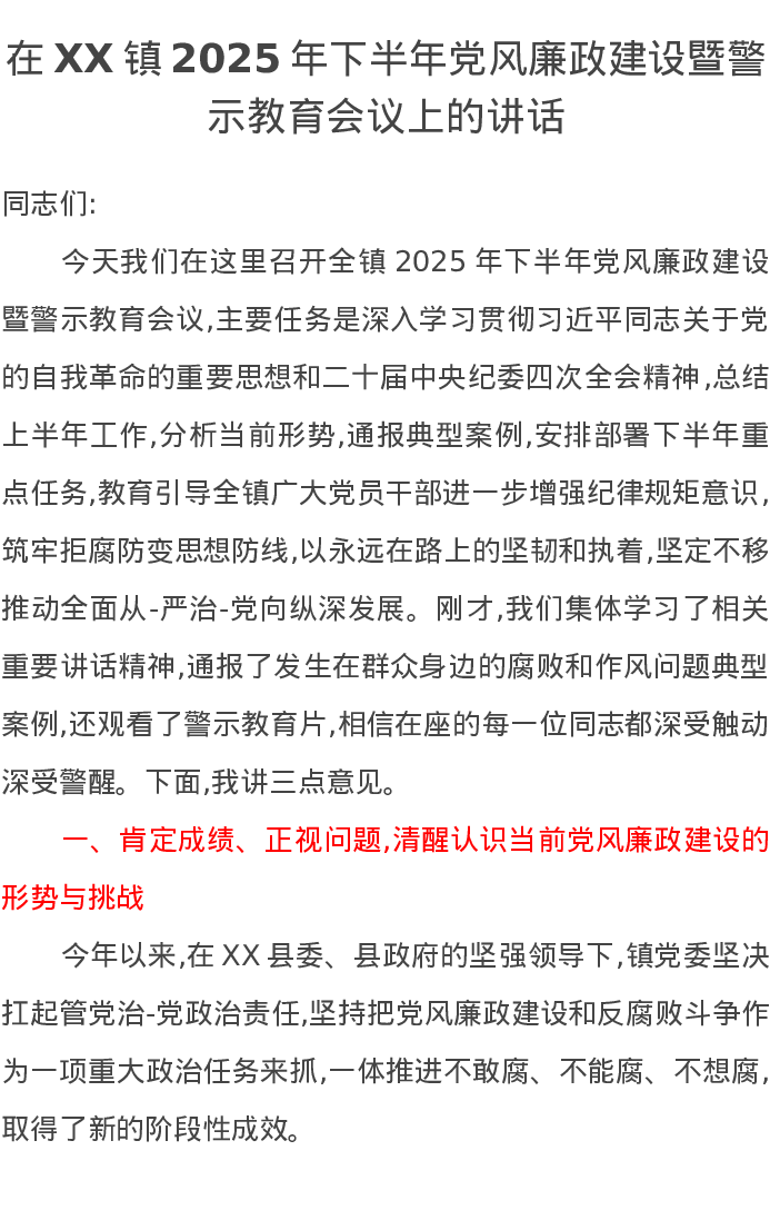 在XX镇2025年下半年党风廉政建设暨警示教育会议上的讲话