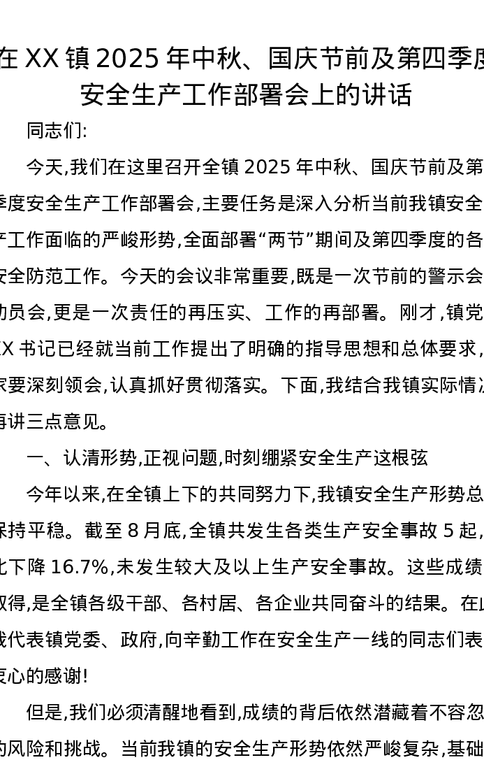在XX镇2025年中秋、国庆节前及第四季度安全生产工作部署会上的讲话