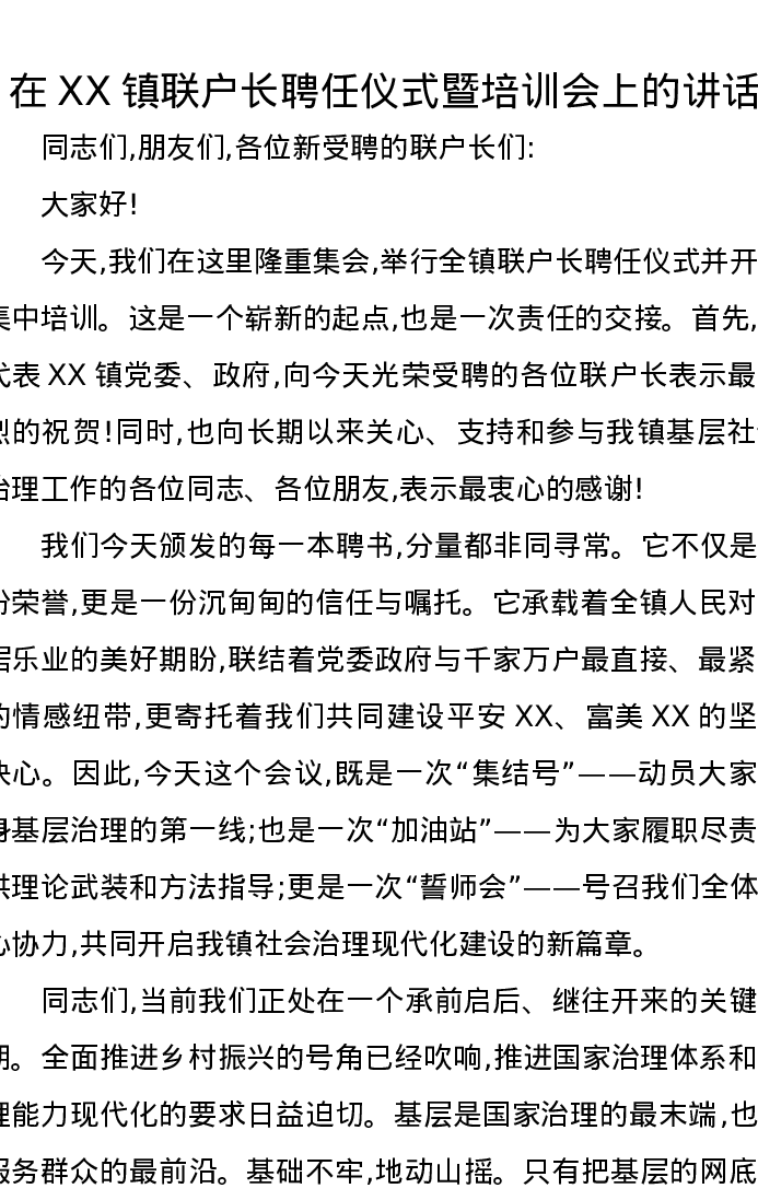 在XX镇联户长聘任仪式暨培训会上的讲话