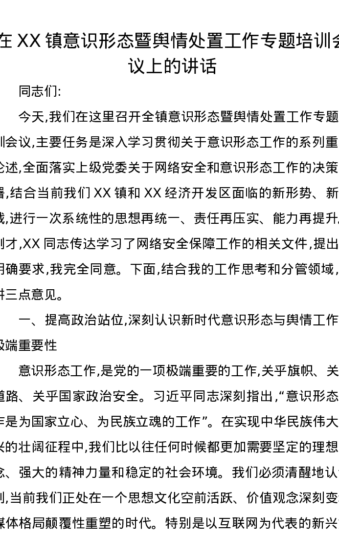 在XX镇意识形态暨舆情处置工作专题培训会议上的讲话