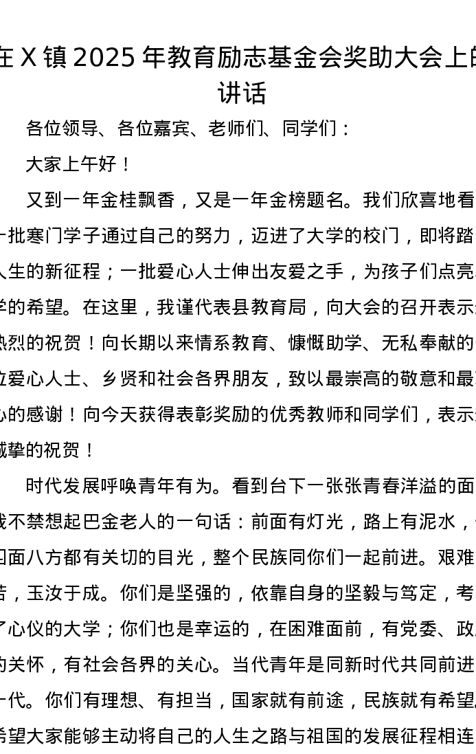 在X镇2025年教育励志基金会奖助大会上的讲话