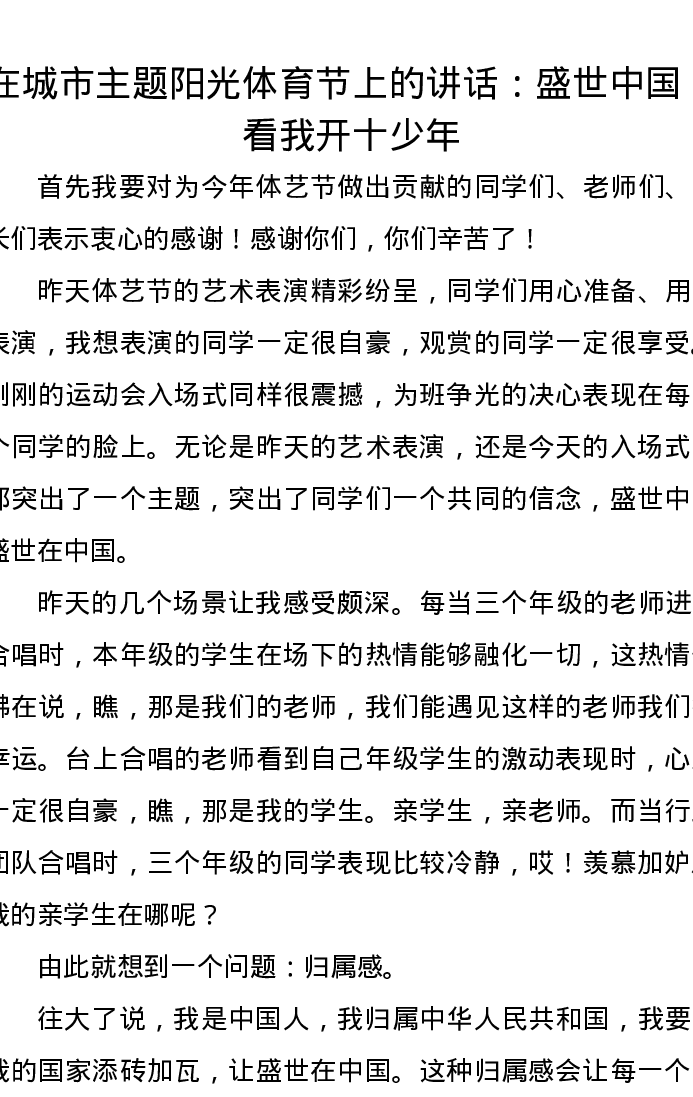 在城市主题阳光体育节上的讲话:盛世中国,看我开十少年