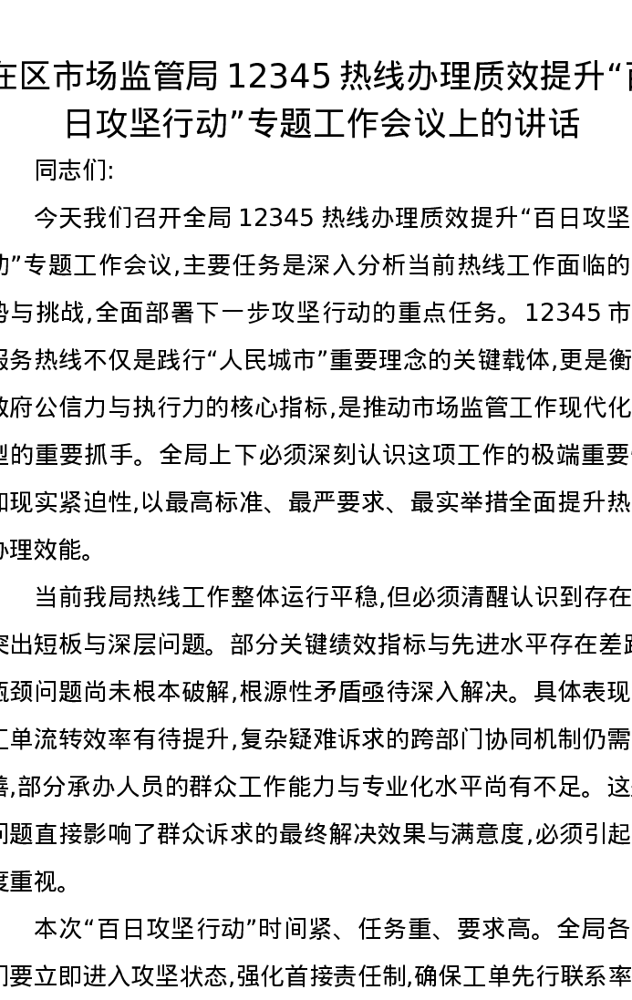 在区市场监管局12345热线办理质效提升“百日攻坚行动”专题工作会议上的讲话