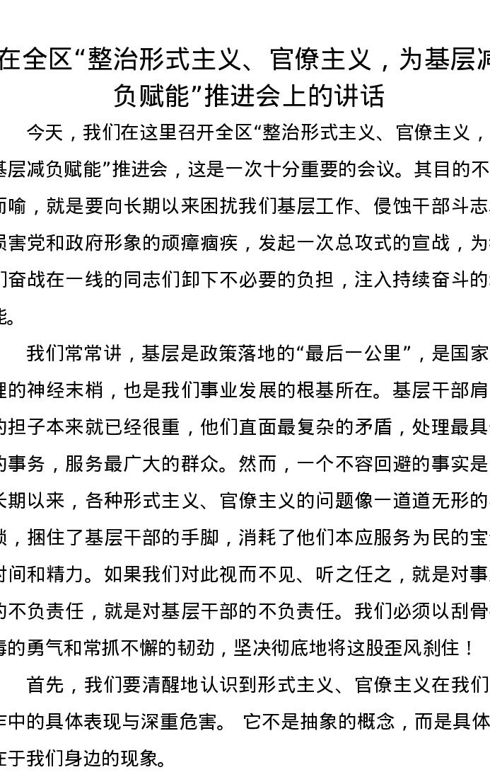 在全区“整治形式主义、官僚主义,为基层减负赋能”推进会上的讲话