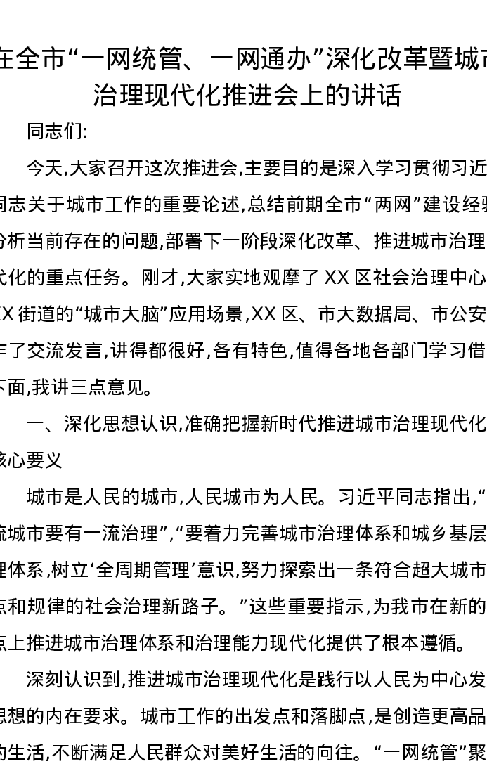 在全市“一网统管、一网通办”深化改革暨城市治理现代化推进会上的讲话