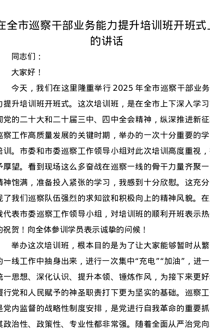 在全市巡察干部业务能力提升培训班开班式上的讲话