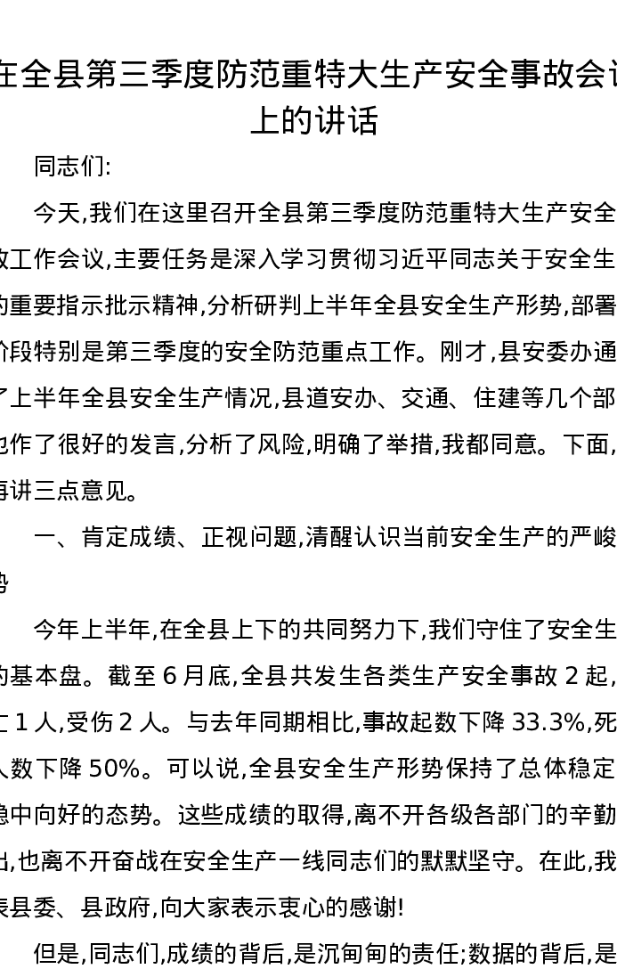 在全县第三季度防范重特大生产安全事故会议上的讲话