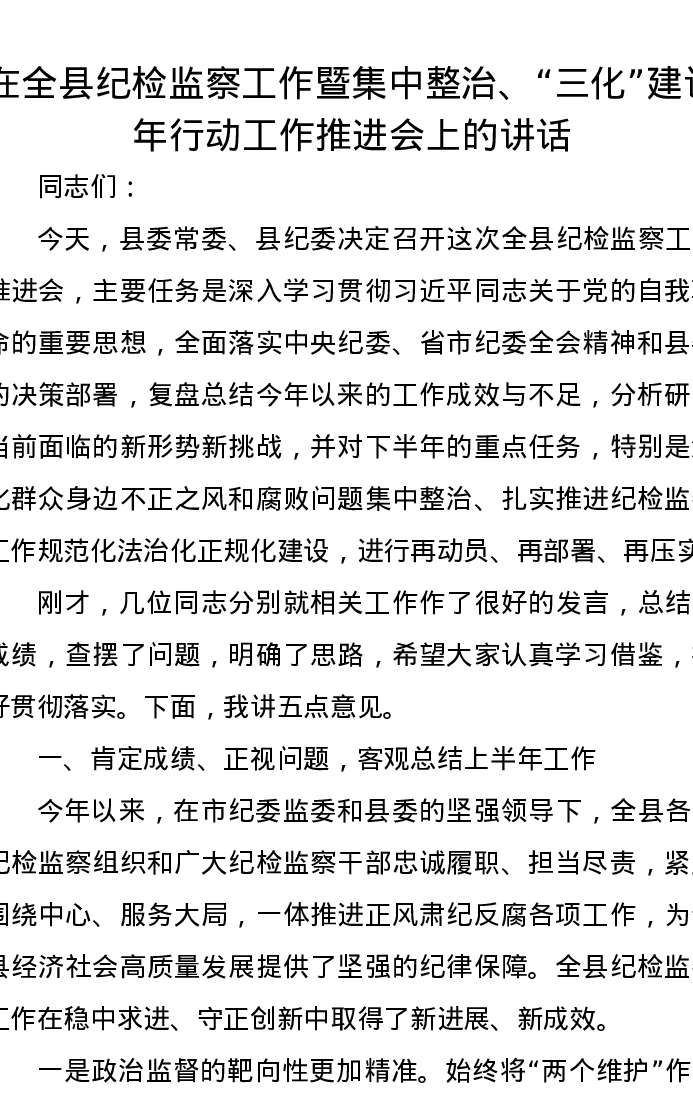 在全县纪检监察工作暨集中整治、“三化”建设年行动工作推进会上的讲话