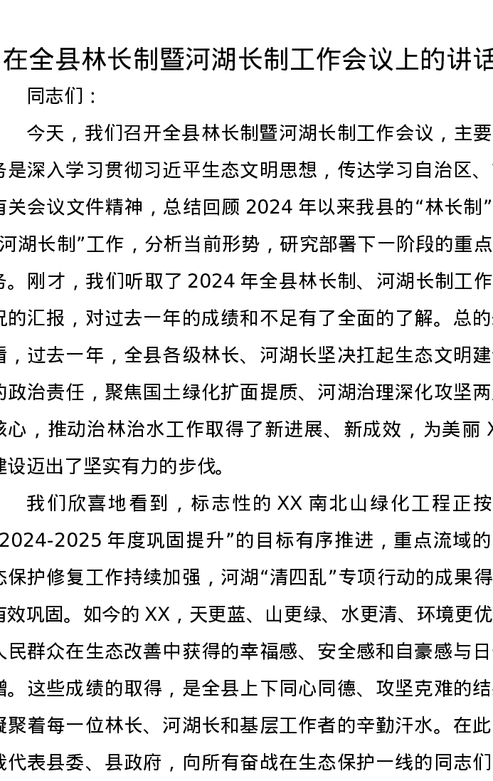 在全县林长制暨河湖长制工作会议上的讲话