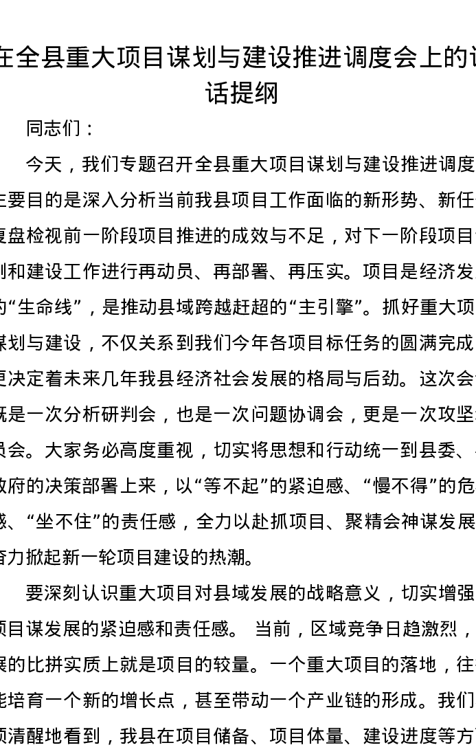 在全县重大项目谋划与建设推进调度会上的讲话提纲