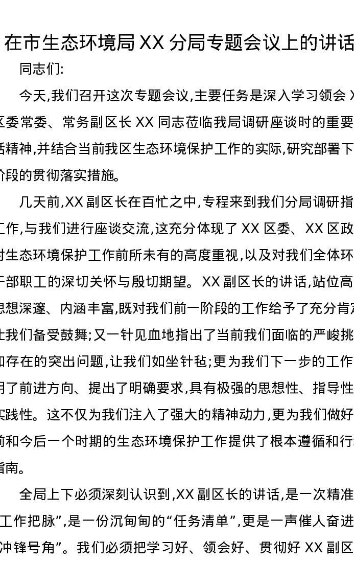 在市生态环境局XX分局专题会议上的讲话