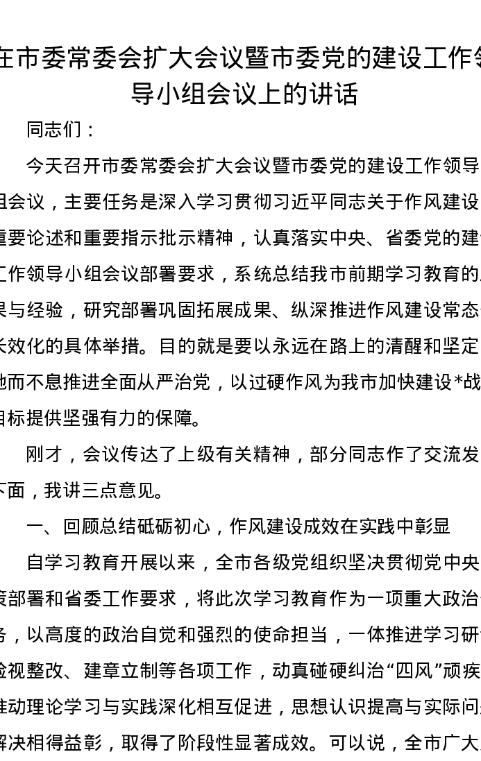 在市委常委会扩大会议暨市委党的建设工作领导小组会议上的讲话