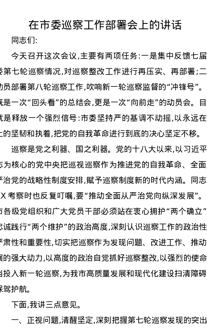 在市委巡察工作部署会上的讲话