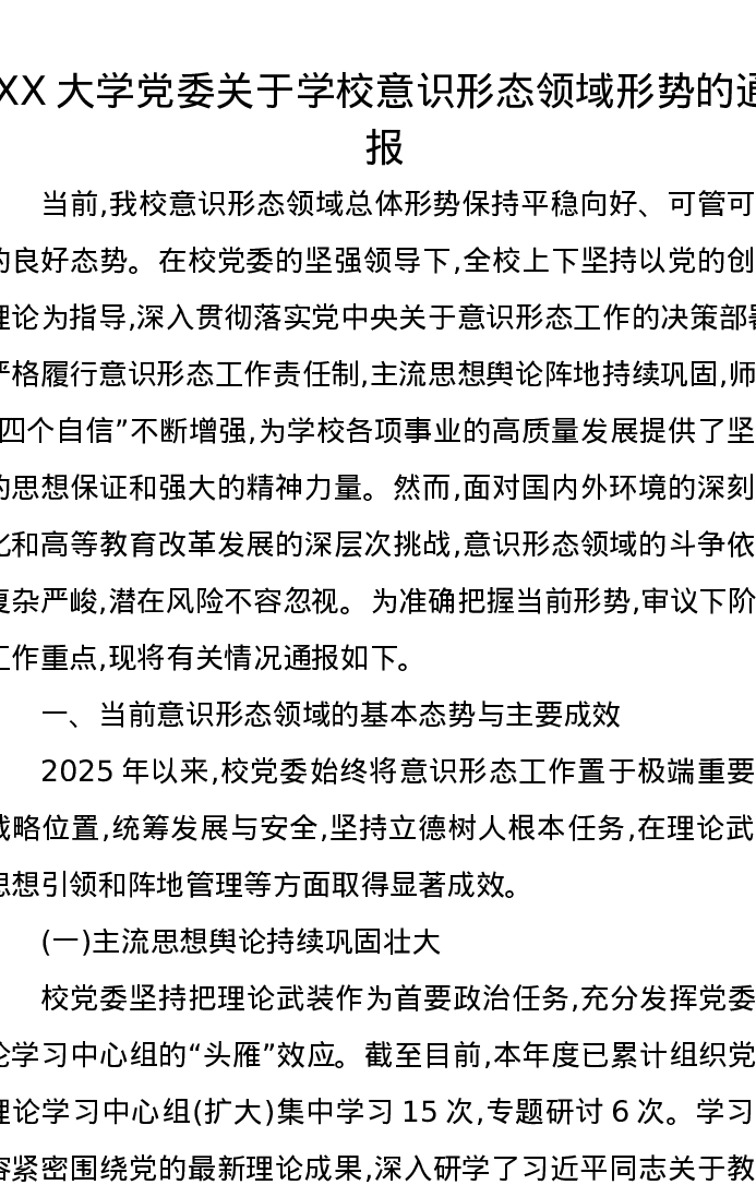 XX大学党委关于学校意识形态领域形势的通报
