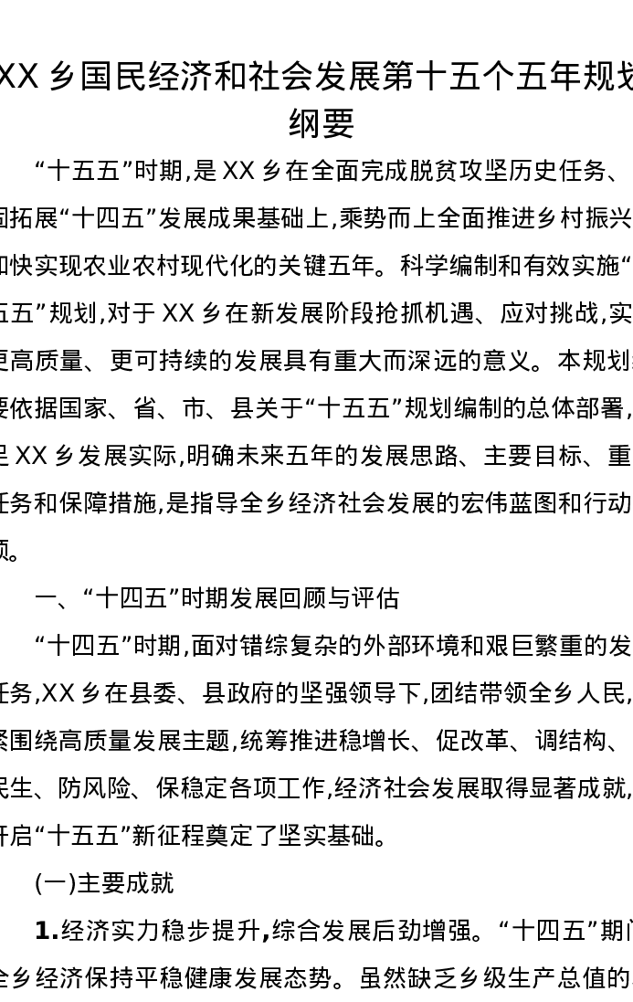 XX乡国民经济和社会发展第十五个五年规划纲要