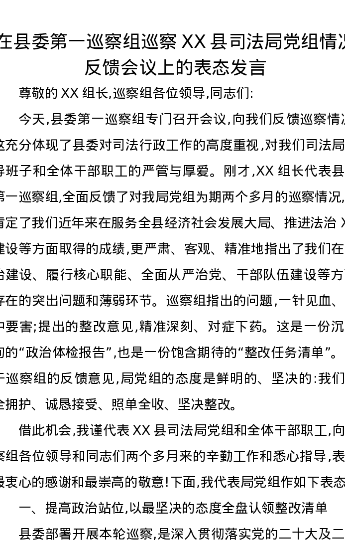 在县委第一巡察组巡察XX县司法局党组情况反馈会议上的表态发言