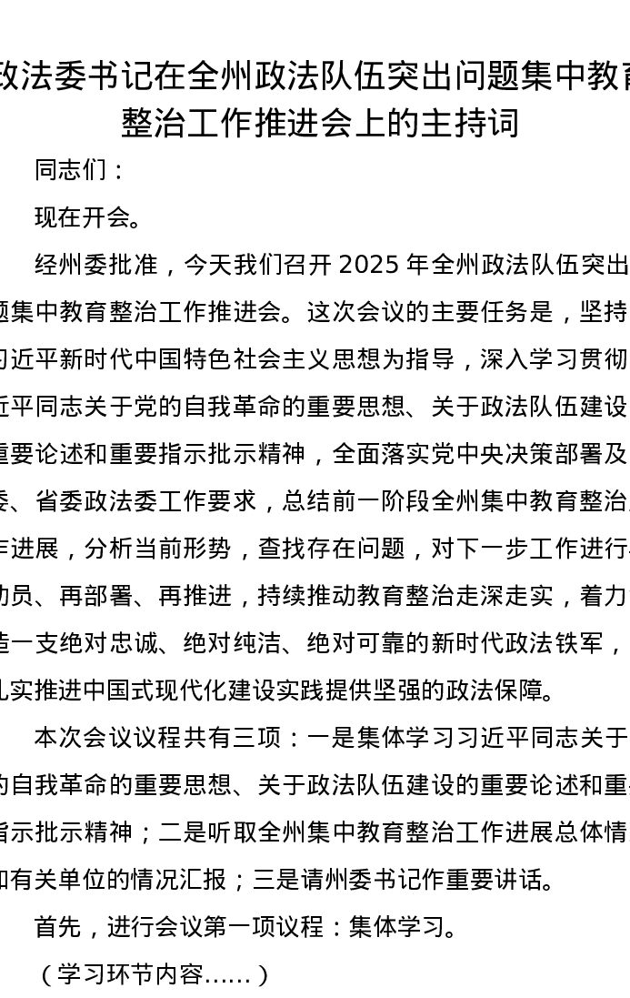 政法委书记在全州政法队伍突出问题集中教育整治工作推进会上的主持词